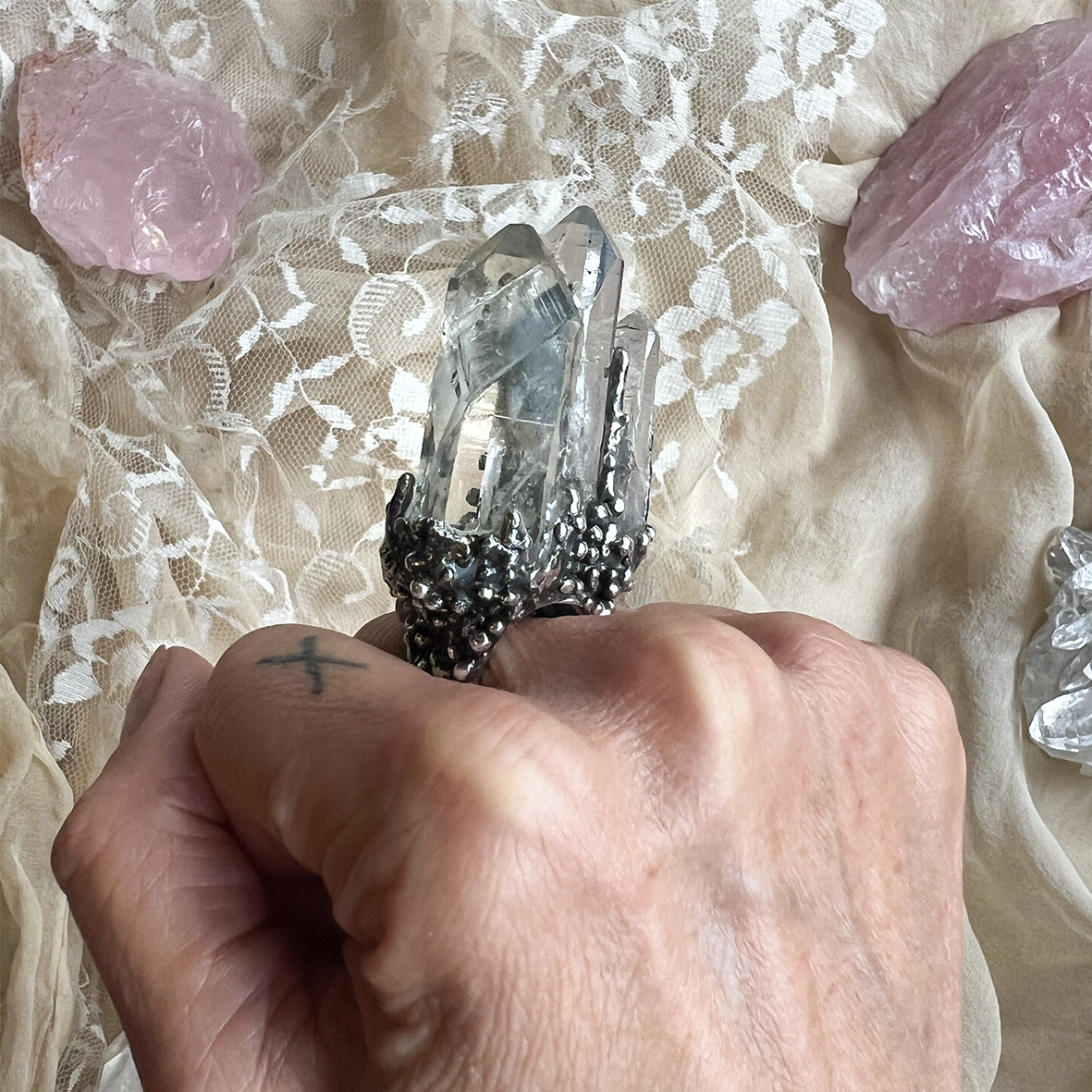 This bold, handcrafted ring transcends mere jewelry to embody a true work of art. Inspired by the ethereal beauty of raw clear quartz and the enchanting world of The NeverEnding Story, this piece draws upon the sacred design of the Childlike Empress’s ceremonial towel.