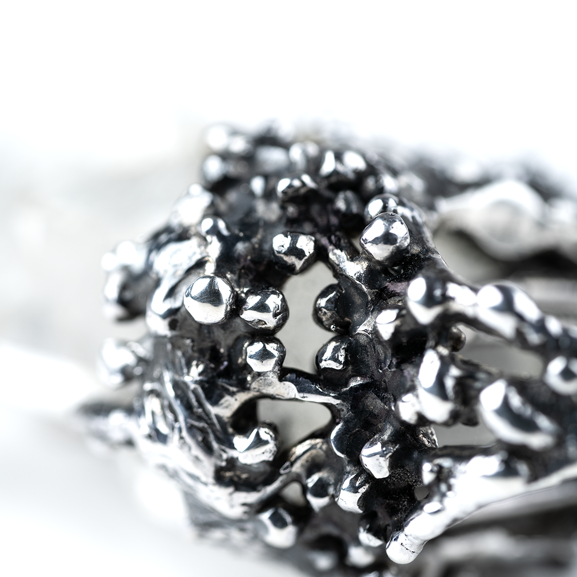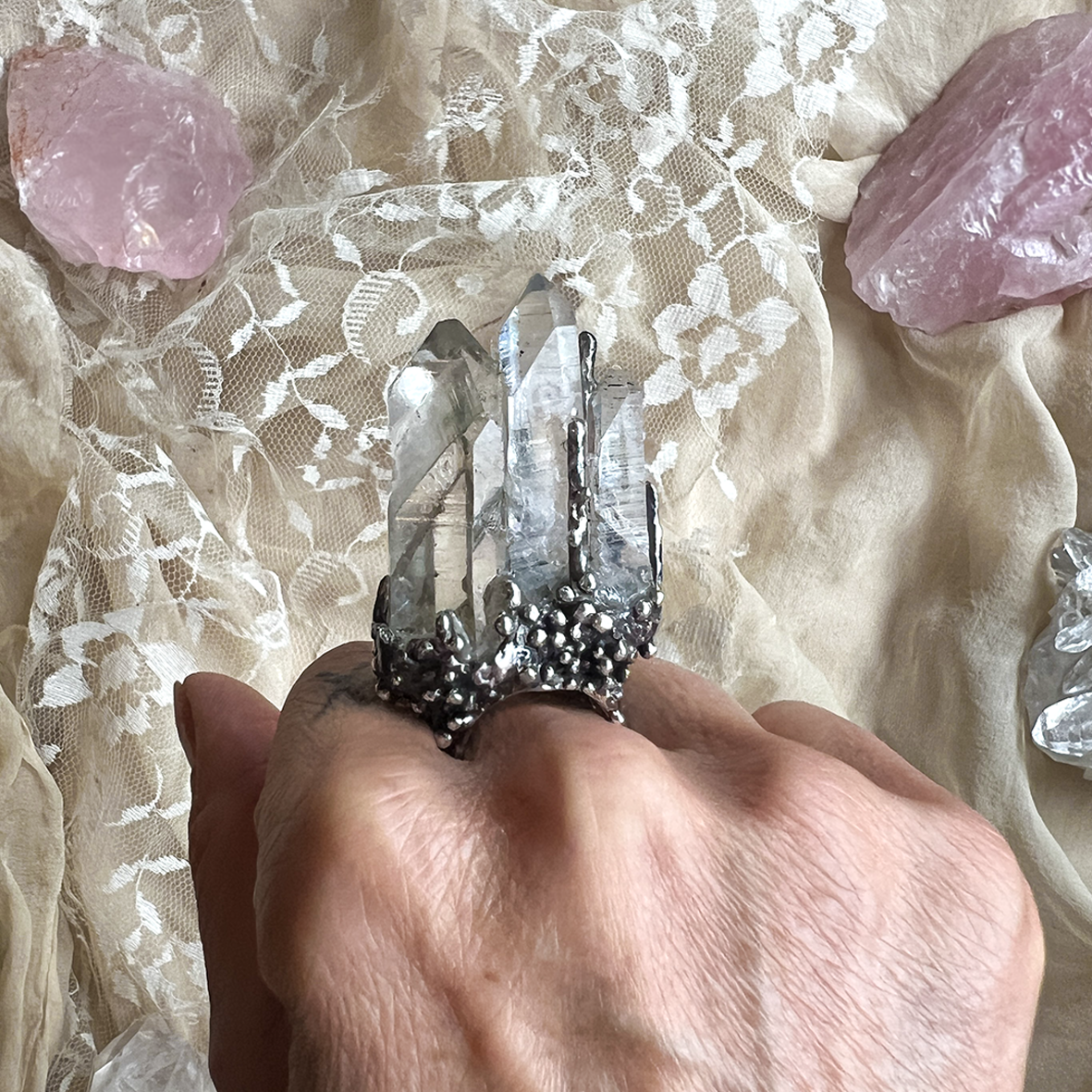 Each detail is meticulously crafted, harmonizing the organic allure of uncut crystals with an air of magic. This unique statement ring invites you to embrace a sophisticated blend of fantasy, nature, and artistry, making it a remarkable addition to any discerning collection.