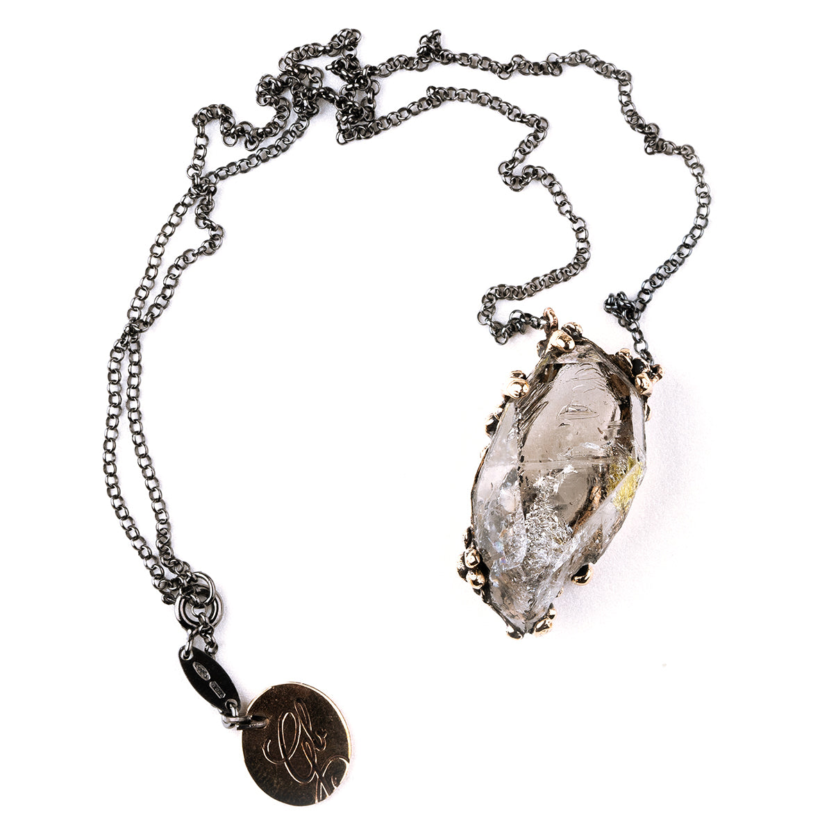 MATERIALS: sterling silver (chain), Bronze (frame) and Herkimer Diamond with petroleum and carbon inclusions.