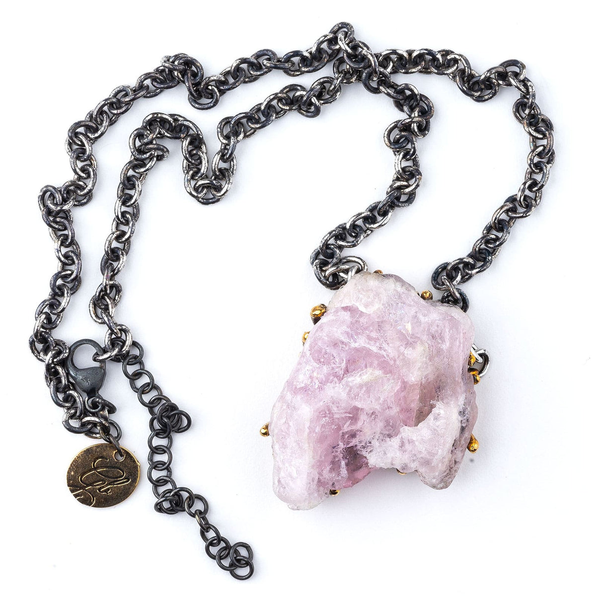 MATERIALS AND FINISHING: bronze(tag and frame), sterling silver (chain), and row Morganite.