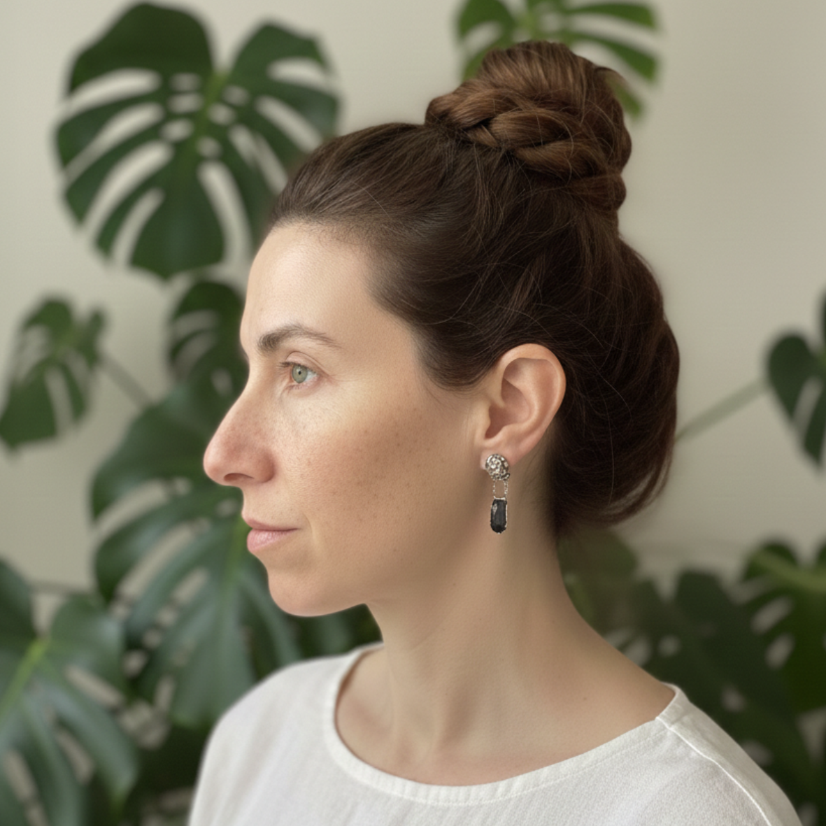 This single earring is a dialogue between two forces that are as different as they are inseparable: Pyrite and Black Tourmaline.