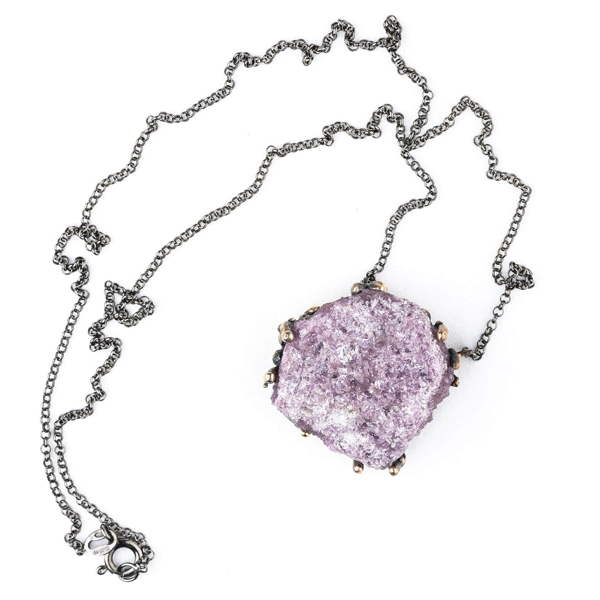 MATERIALS AND FINISHING: nickel-free burnished bronze, oxidized sterling silver, genuine Lepidolite.