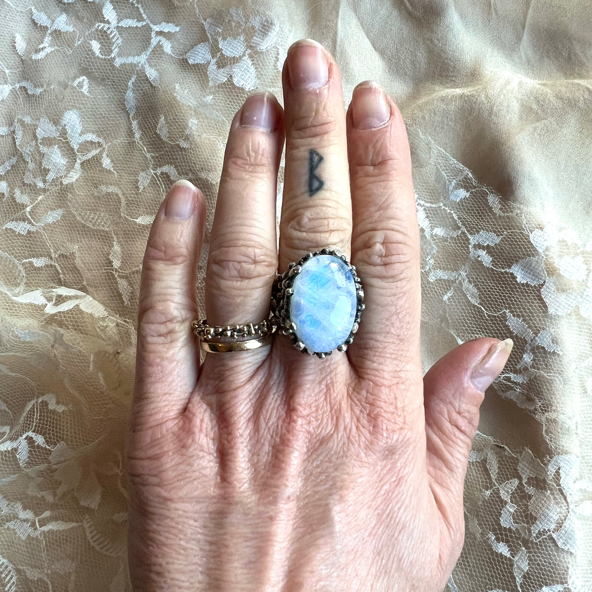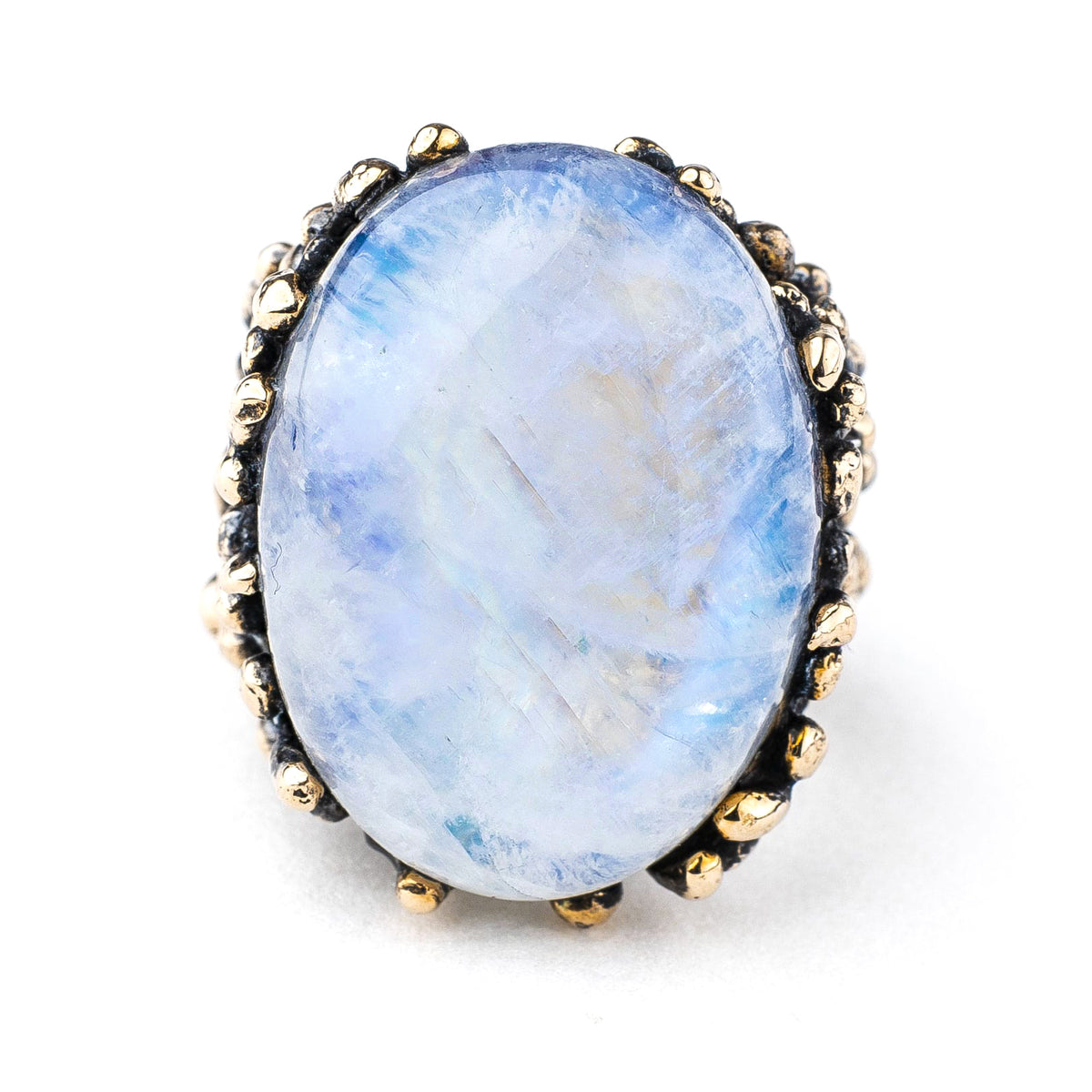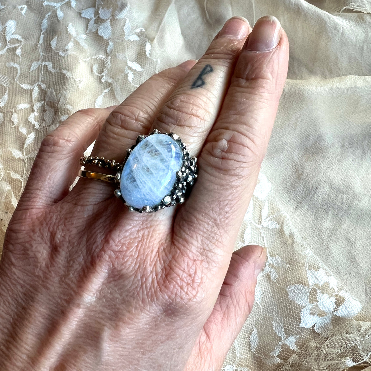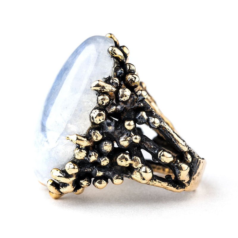 The Rainbow Moonstone ring assists you in raising empathy and non-verbal communication, finding a way to mitigate conflicts by understanding situations and people deeply.