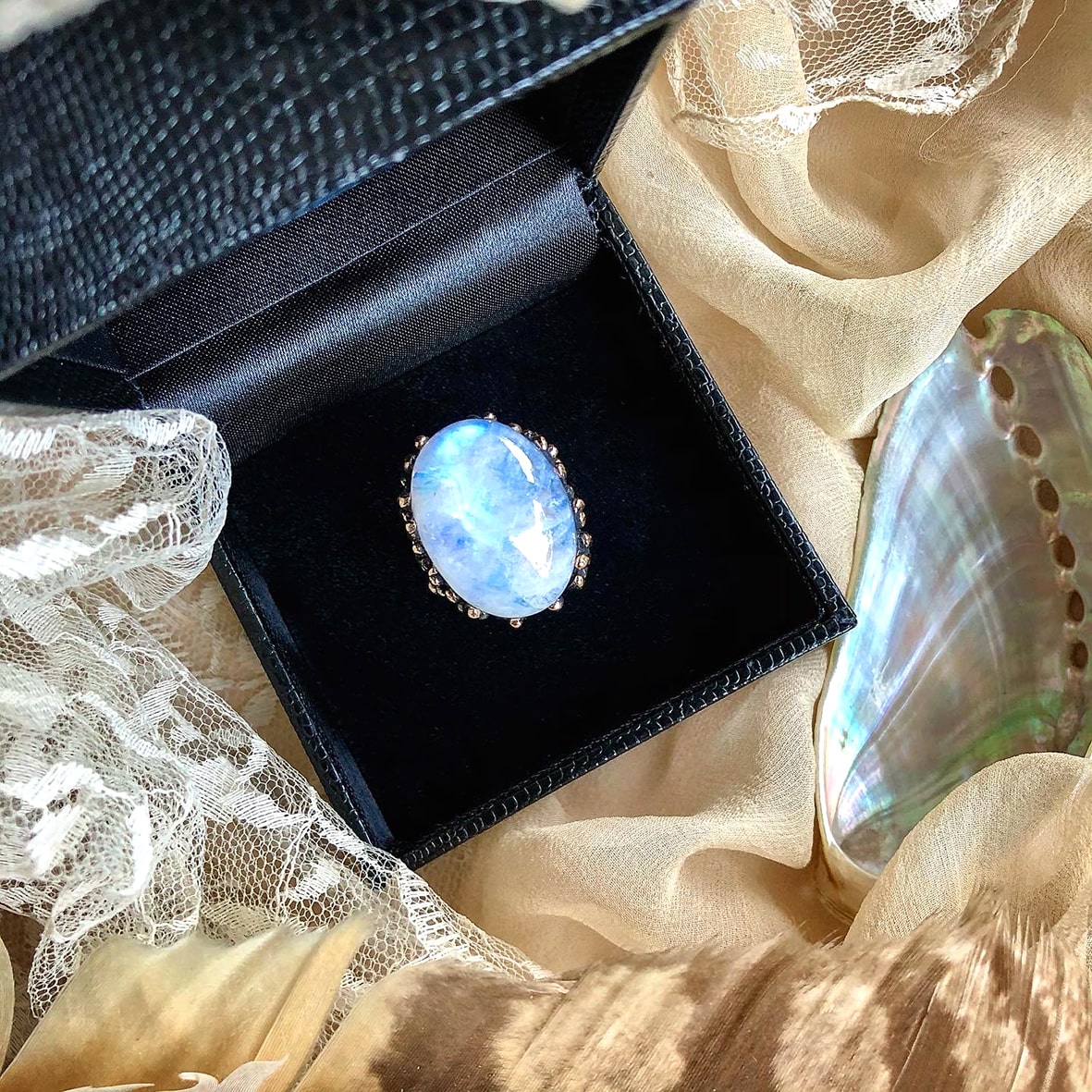 • Rainbow Moonstone ring assists you in sharing your intuitions and visions with others, supporting you in harmonizing conflicts and raising empathy.