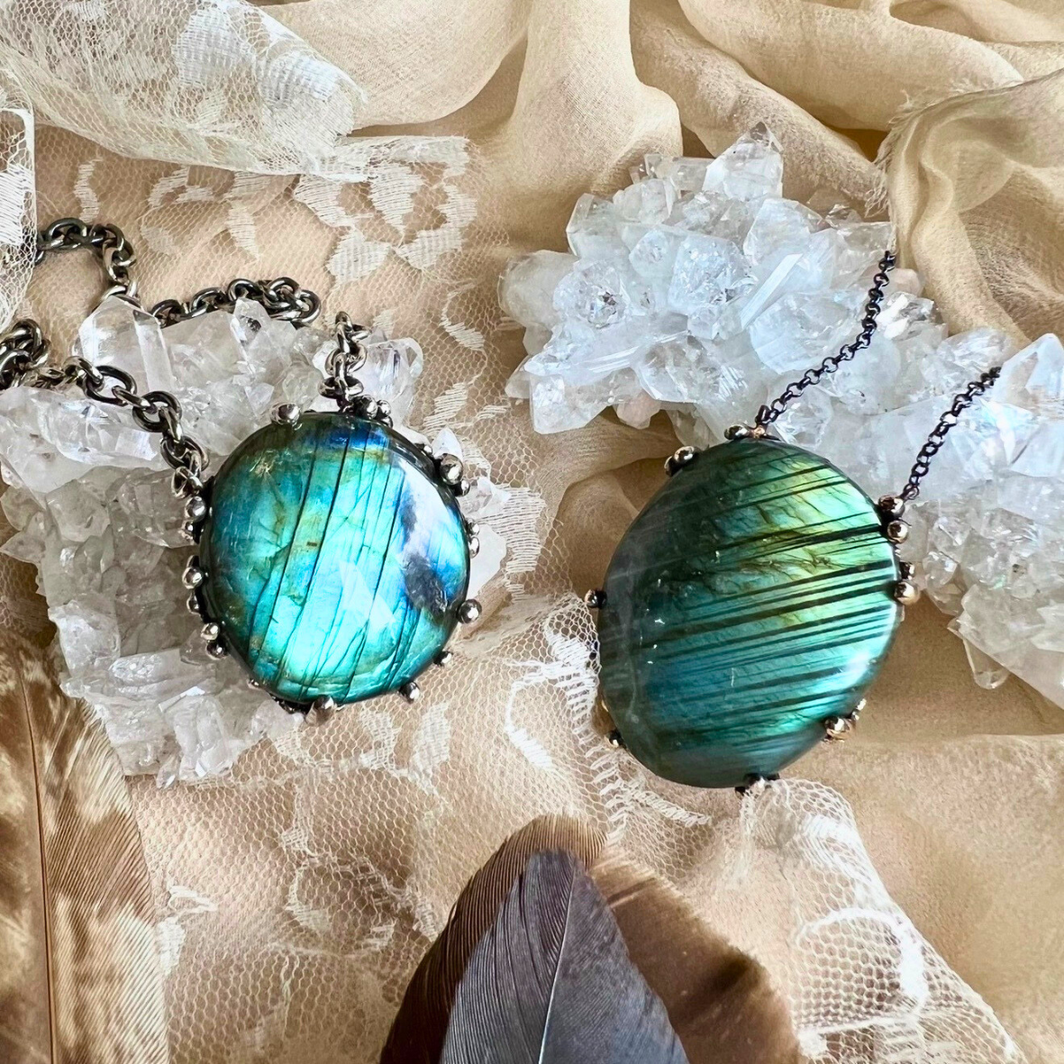 MATERIALS: Oxidized sterling silver chain, Labradorite, and nickel-free bronze (frame).