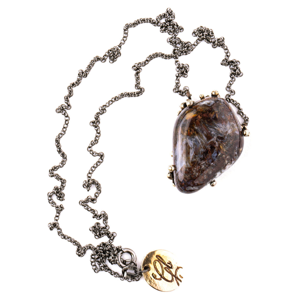 MATERIALS AND FINISHING: Pietersite, oxidized sterling silver (chain), bronze.