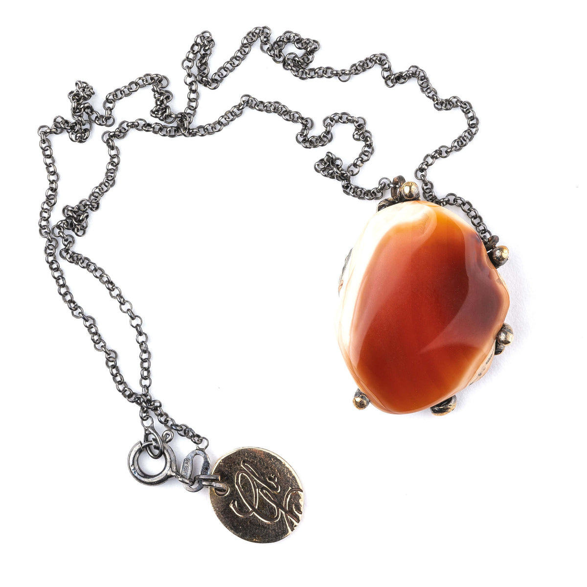 MATERIALS AND FINISHING: nickel-free bronze (frame and tag), sterling silver (chain), and Carnelian.