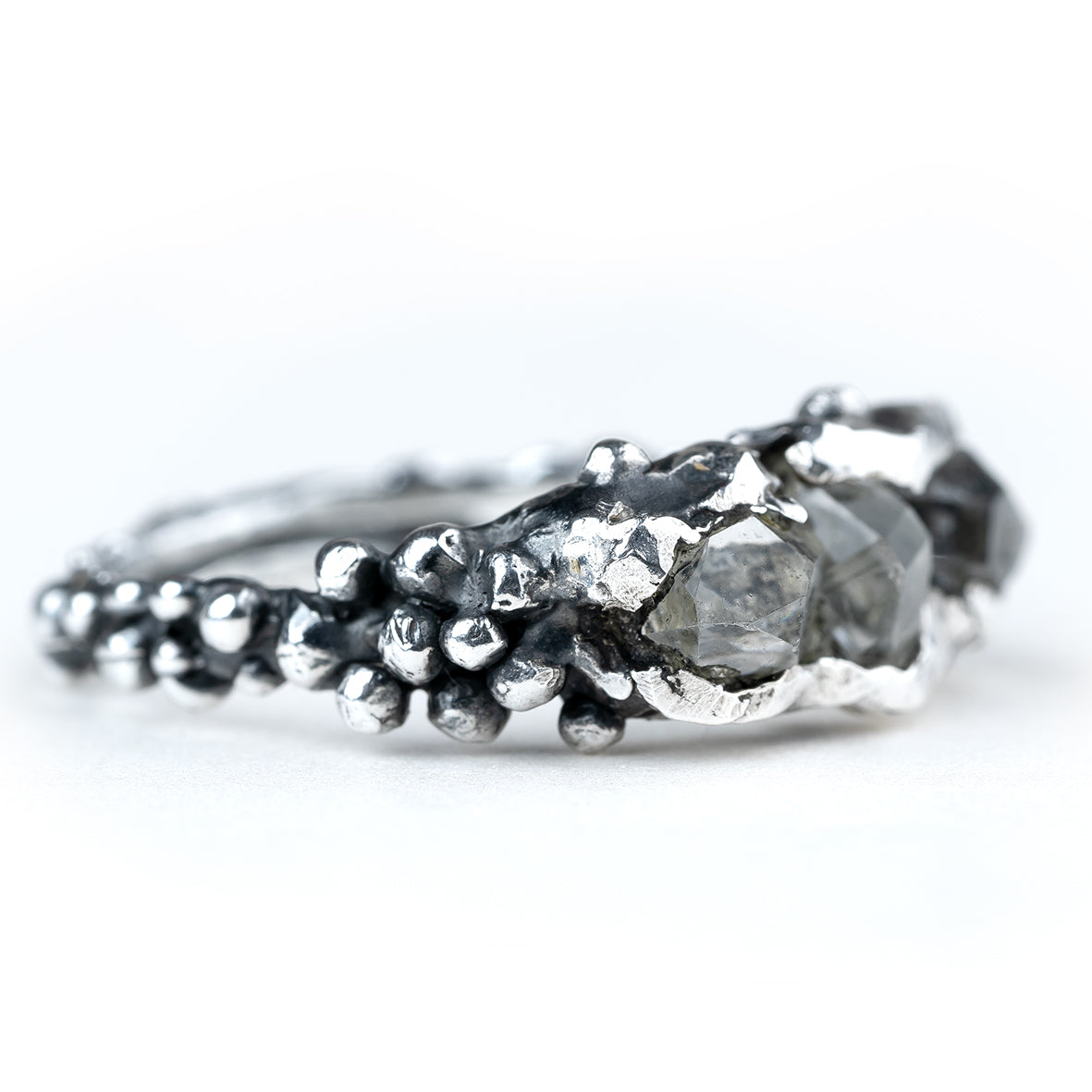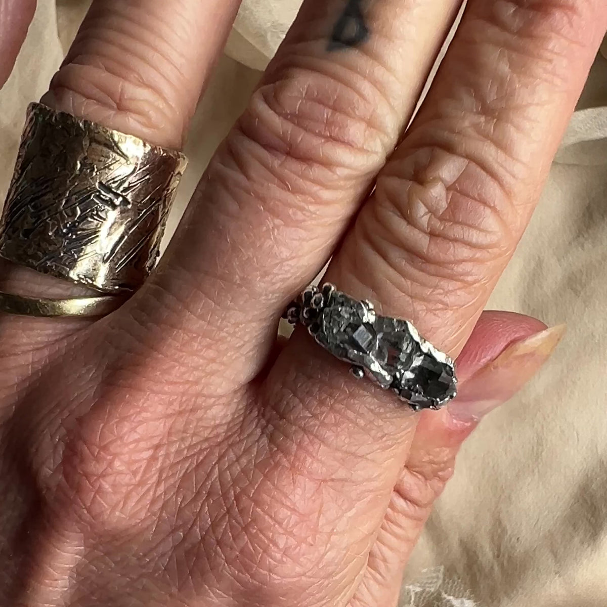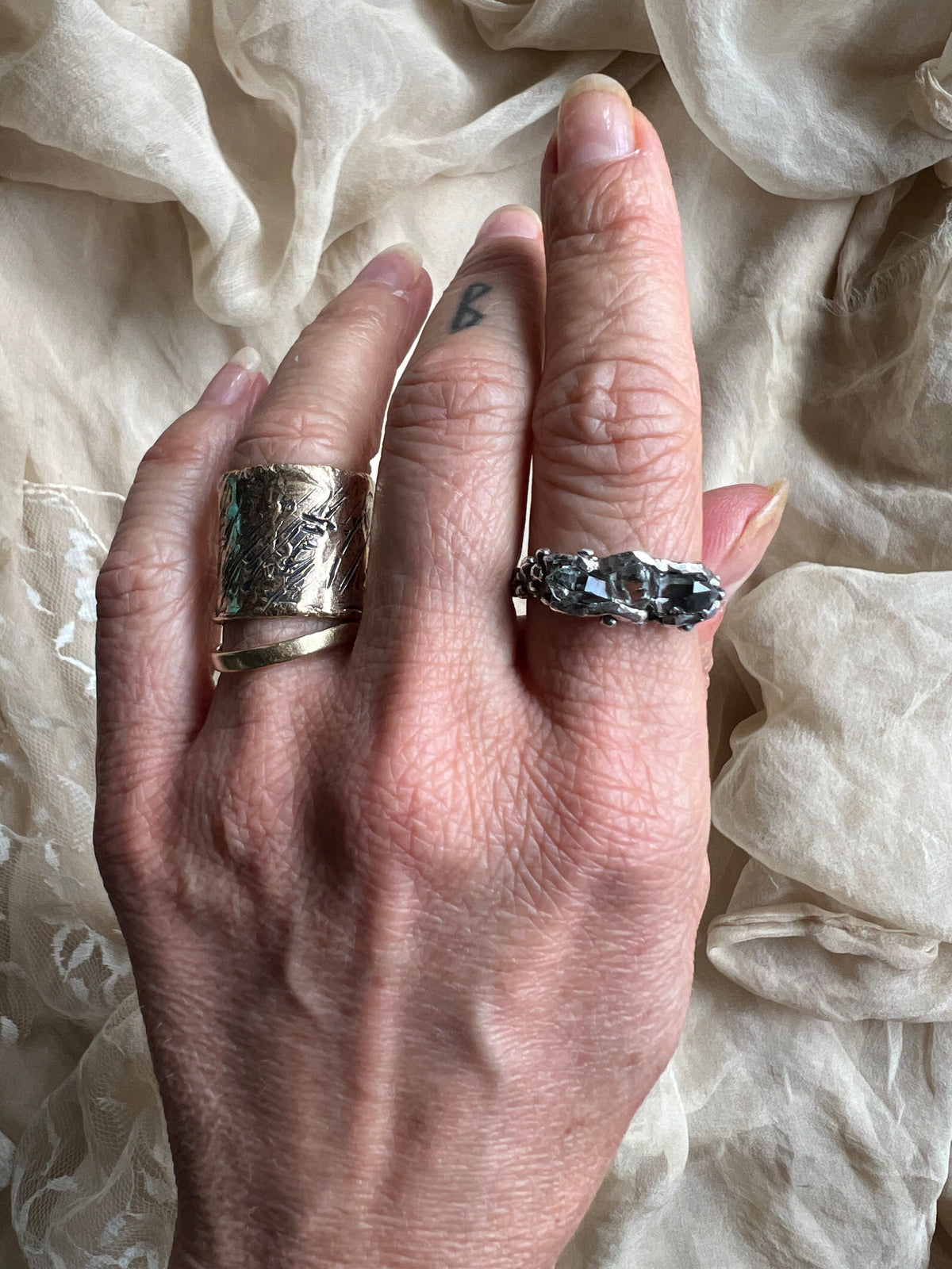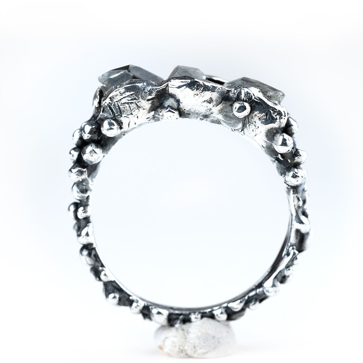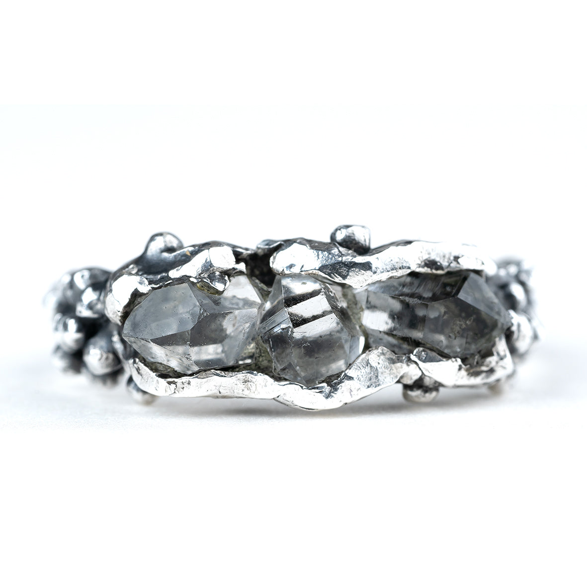 This band ring features three Herkimer Diamonds, where the raw elegance of the genuine Herkimer diamond is perfectly complemented by the ring’s organic design, creating a harmonious balance of rugged charm and refined artistry.