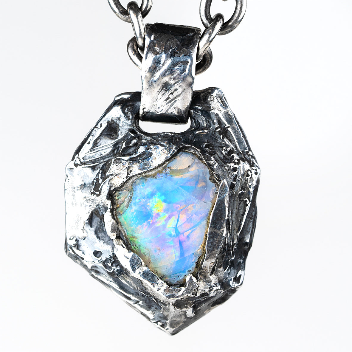 The centerpiece of this pendant is a striking raw noble opal, celebrated for its mesmerizing play of colors and deep connection to creativity, intuition, and transformation.